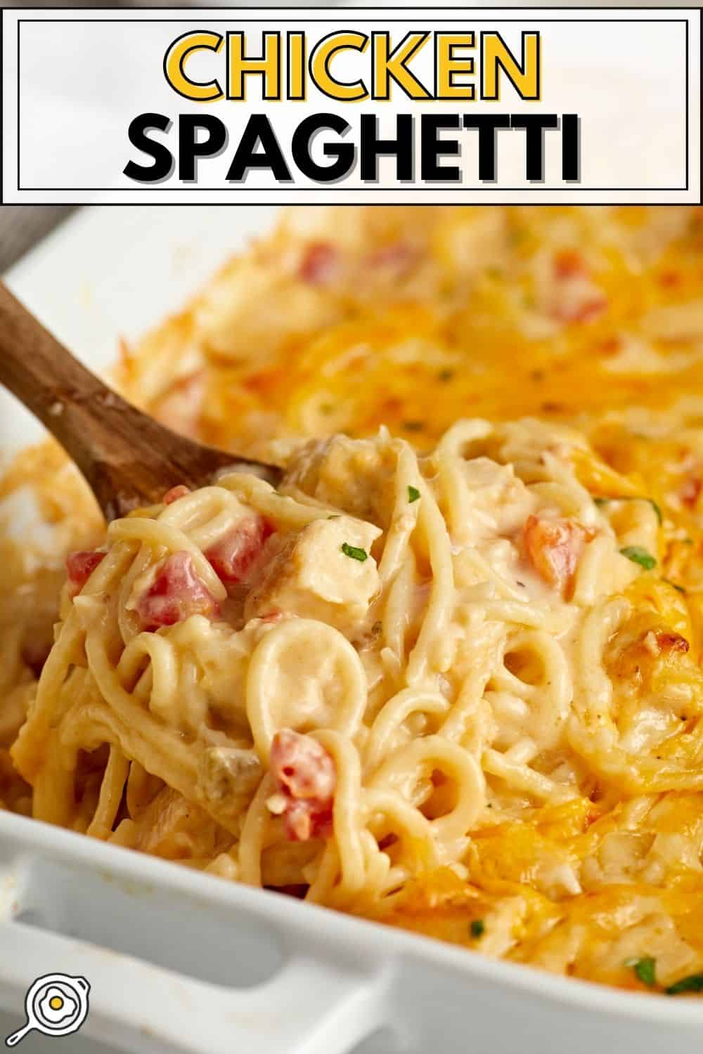 Add the chicken spaghetti mixture to a 9×13" casserole dish. Top with the remaining 1/2 cup of cheddar cheese and 1/2 cup of mozzarella cheese.