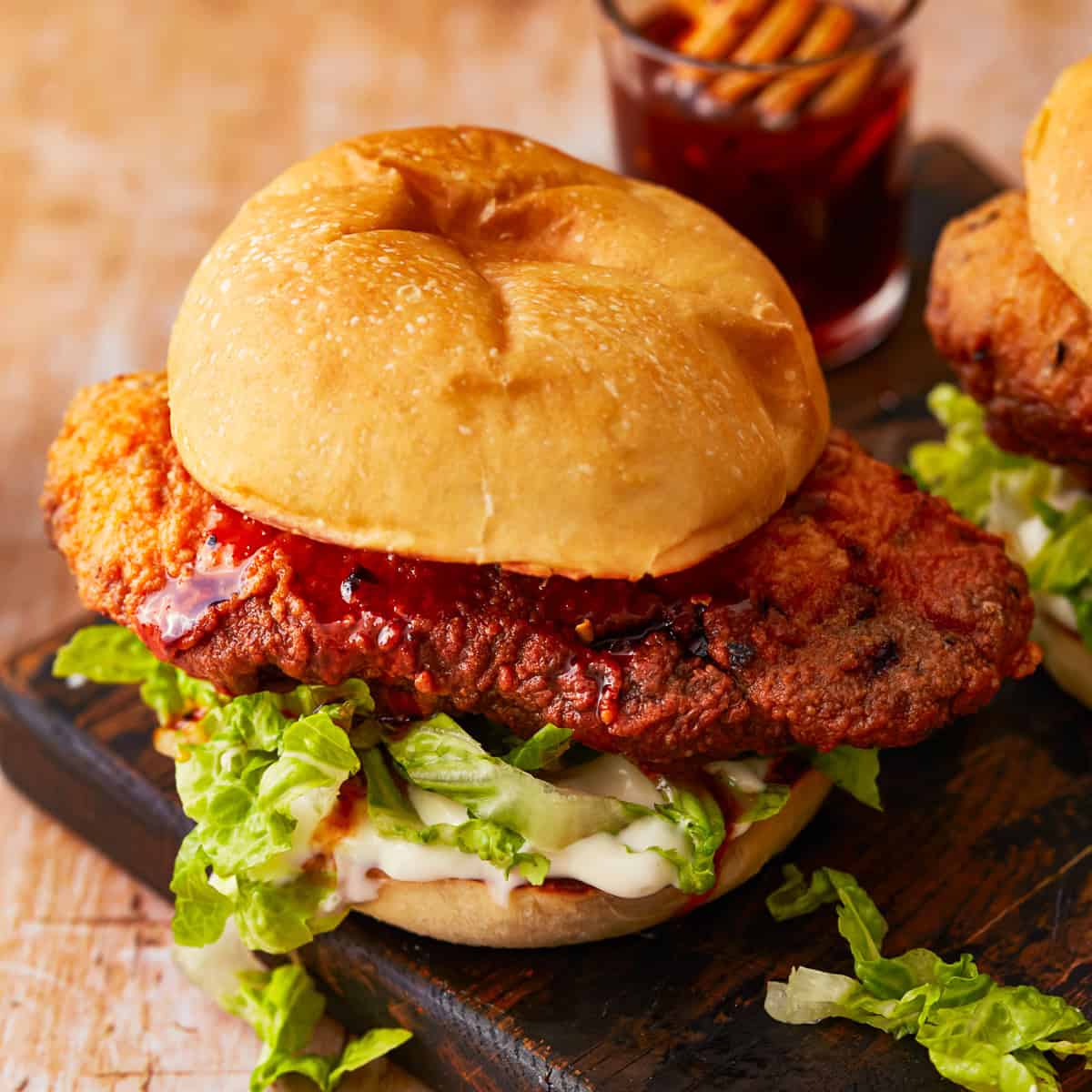 To assemble, spread mayonnaise on the bottom part of each toasted bun (brioche buns are my favorite because they have a great buttery flavor) and add lettuce. Place the fried chicken on the lettuce, and generously drizzle with hot honey sauce. Top with pickles and the other half of the bun.